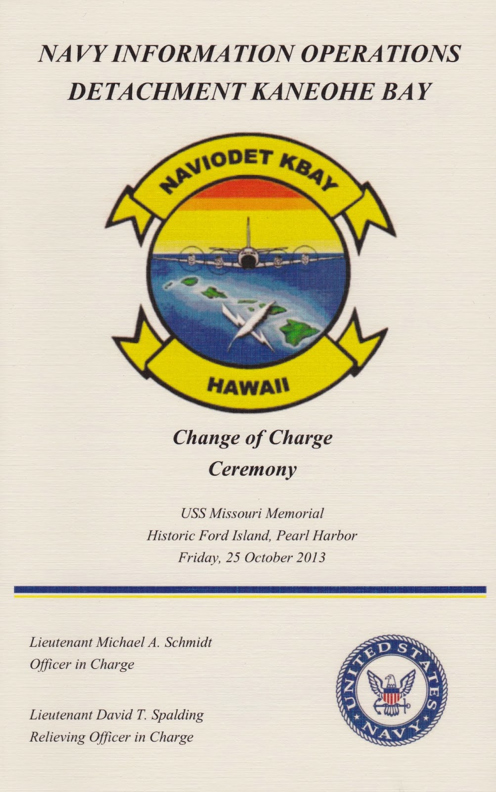 | The guest book for the change of charge ceremony at which LT Chuck Kasinger assumed charge of NSGD Barber’s Point from me on 14 April 1989. |